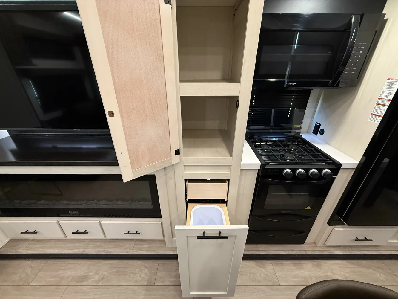 • Trash Can Storage and Hidden Drawer (Where Applicable)