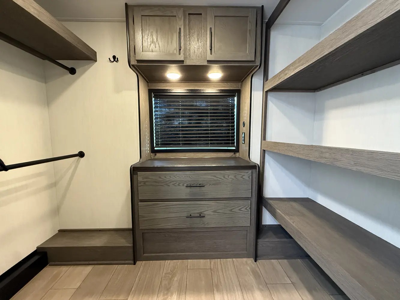• Super-Stor Bedroom Closet w/ Full Depth Hanging Space, Drawers,