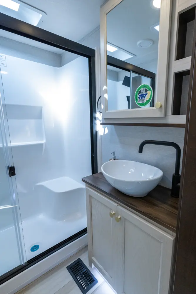 • Full 48” x 30” Rectangular Shower with Seat and Sliding Glass Doors