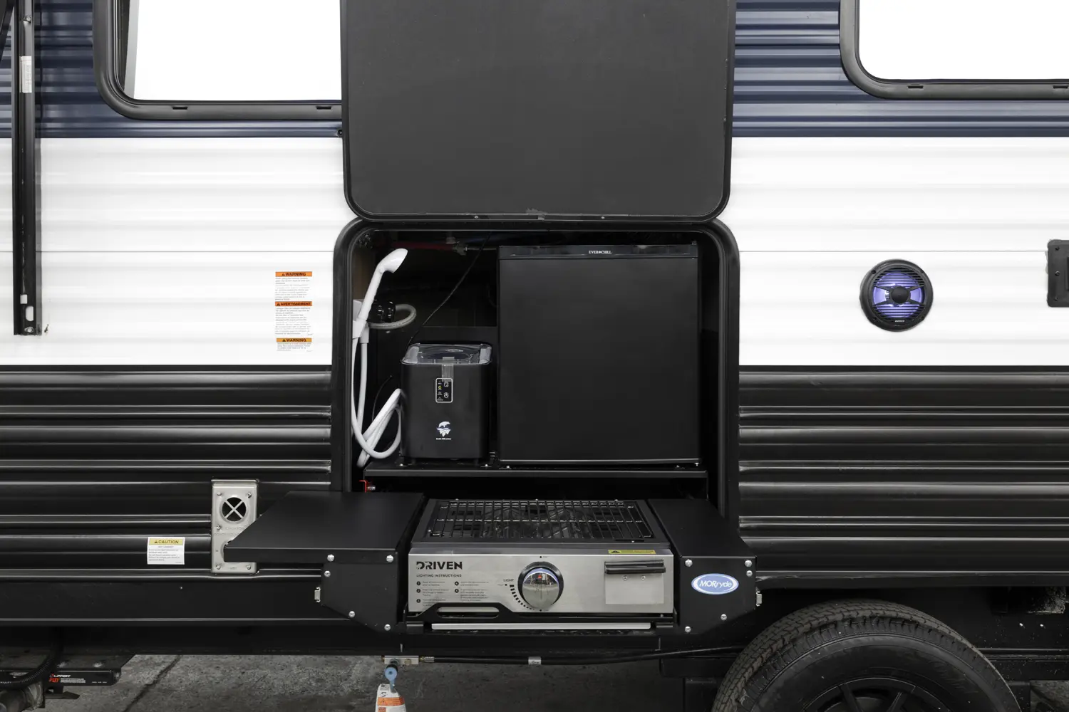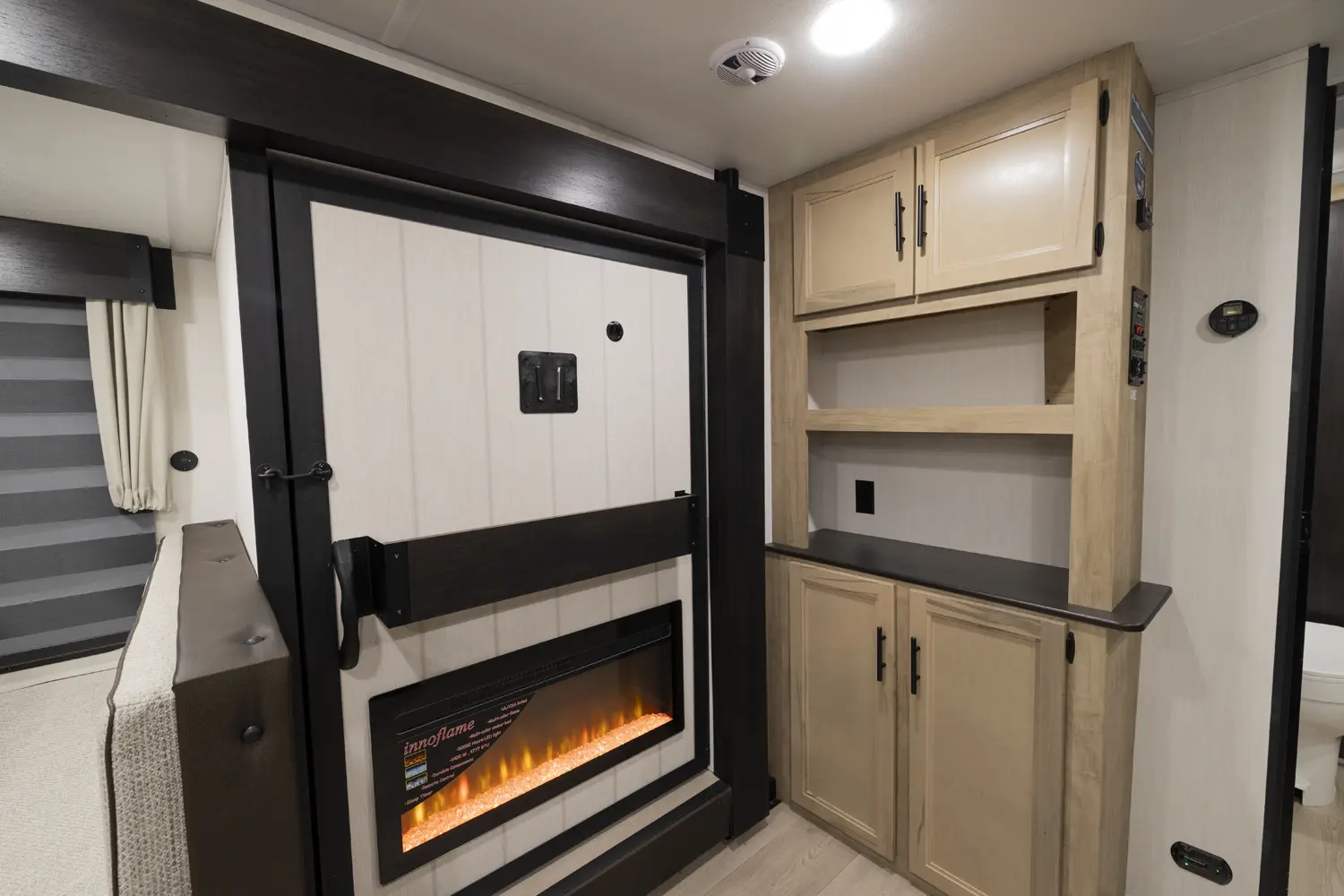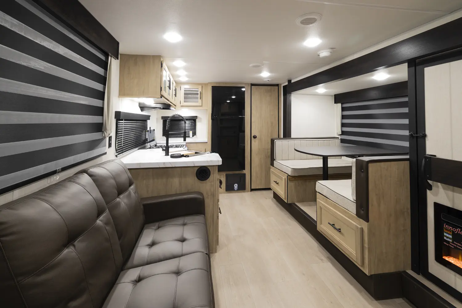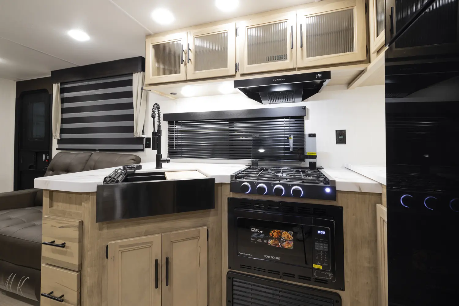 The Cherokee Grey Wolf 26SS by Forest River is a compact yet luxurious travel trailer. Its rear kitchen layout, combined with a large dinette, air fryer combo microwave, 12-volt refrigerator, and ample prep space, makes it perfect for cooking and entertaining. The spacious living area features a convertible sofa for additional sleeping and a hidden pantry for convenient storage. The primary suite, with a king-size bed and ample storage, offers a comfortable and stylish retreat.